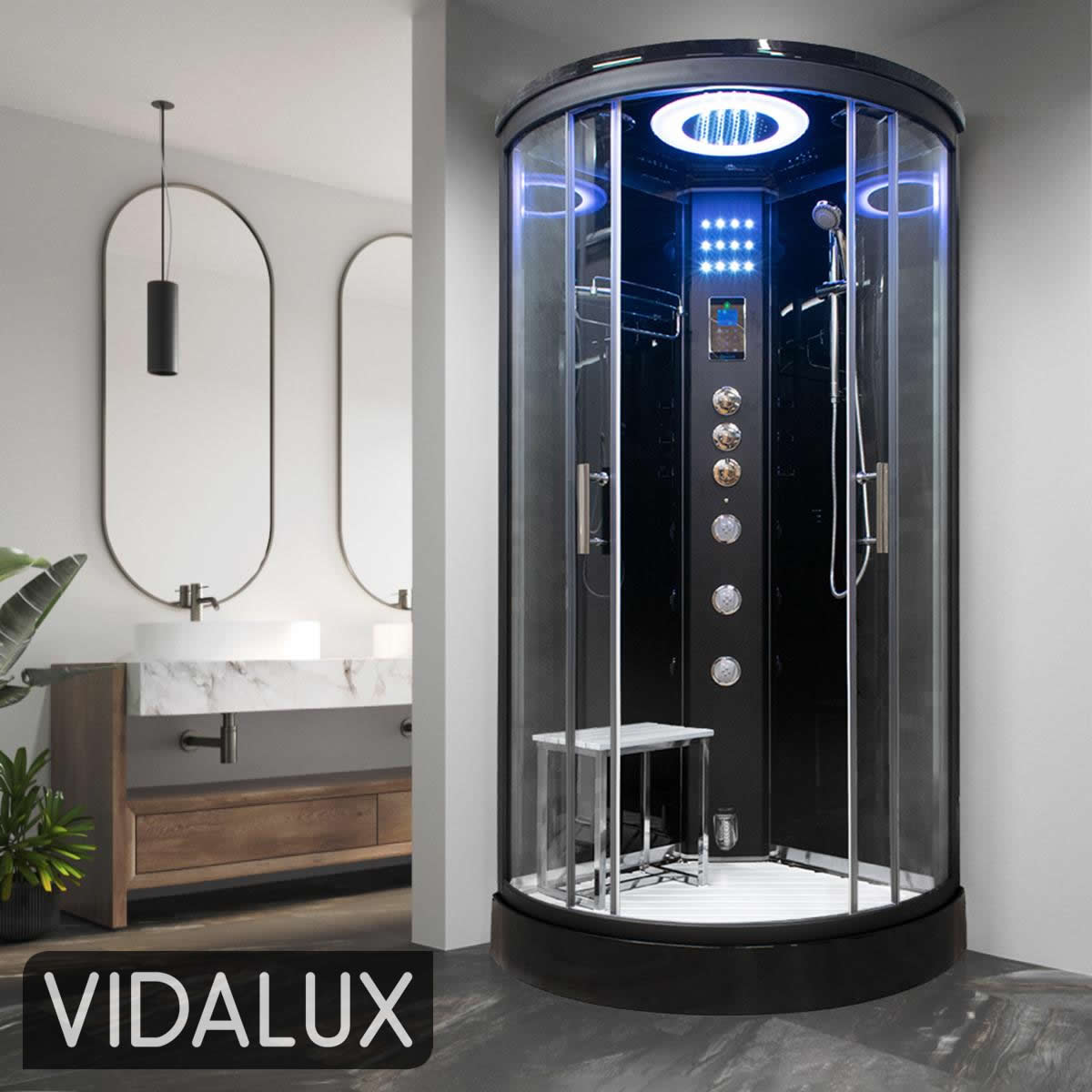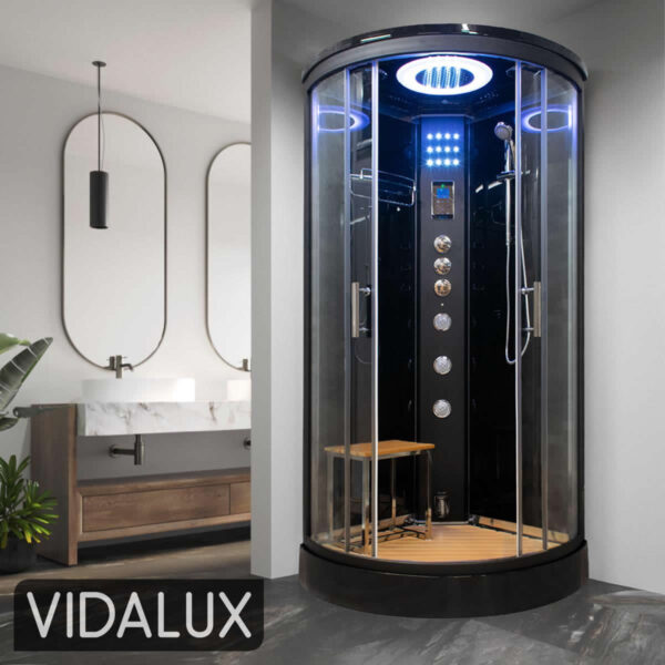 This shower has it all, mould protected plaswood freestanding stool and matching floor insert, Bluetooth streaming connectivity to allow you to play media from your phone, FM Radio, a large stainless steel overhead monsoon shower, Vernet thermostatic shower valve compatible with all combi boiler systems without the need for additional Pressure valves or fittings, 3 adjustable multi-spray body jets with a total of 30 sprays to offer a much more complete massage than single spray systems, Vidalux’s industry-leading fast start steam generator, chromotherapy lighting and more……. so much more