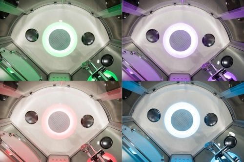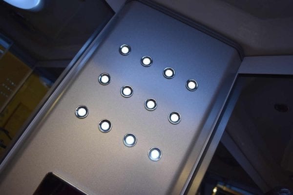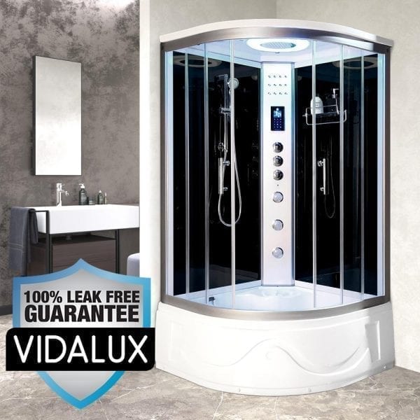 Features on this very popular steam shower cabin include all the most desirable favorites: Bluetooth connectivity to listen to your favorite playlist or FM radio through the high quality speaker system, Vidalux’s renowned quick start steam generator, 8 colour changing chromotherapy lighting that can be set to cycle or set to any colour to perfectly suit your mood, a large, 96 spray stainless steel monsoon shower head, chrome finished hand shower and riser rail and the 3 multi-spray adjustable body jets (30 sprays in total) are on offer to delivery a top-end therapeutic massage, much more effective than the single pin type.